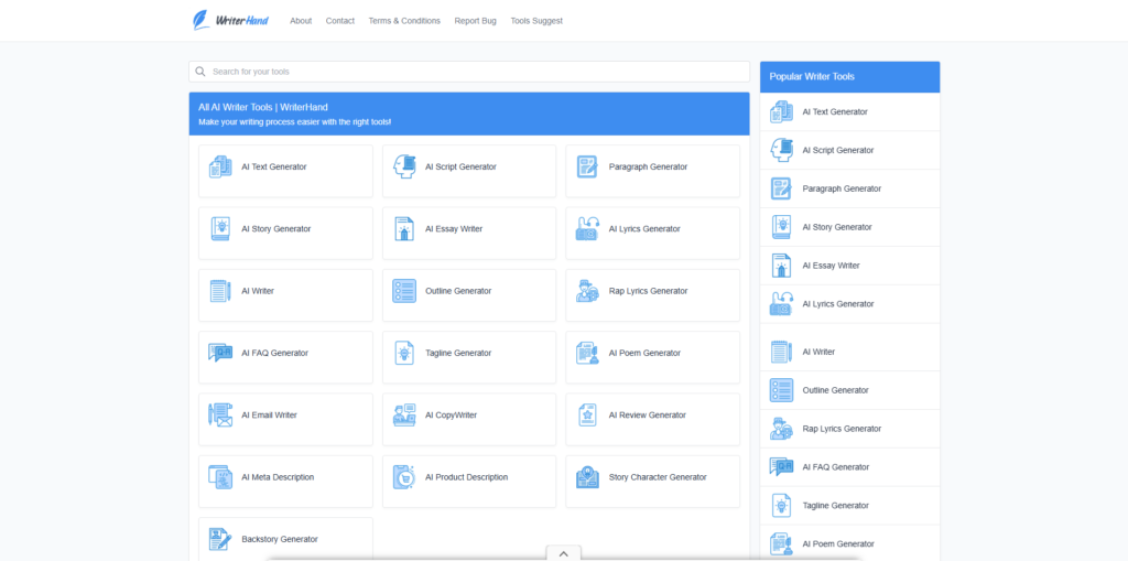 - The platform provides free access to core tools, including WriterHand essay generator, WriterHand content improver, and WriterHand story generator.